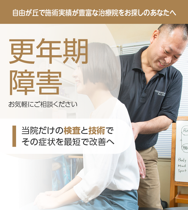 変化を見逃さない一貫性が治療効果を高め、それが当院の豊富な改善実績に繋がっています。更年期障害は神経の専門家であるカイロプラクターにお任せください。